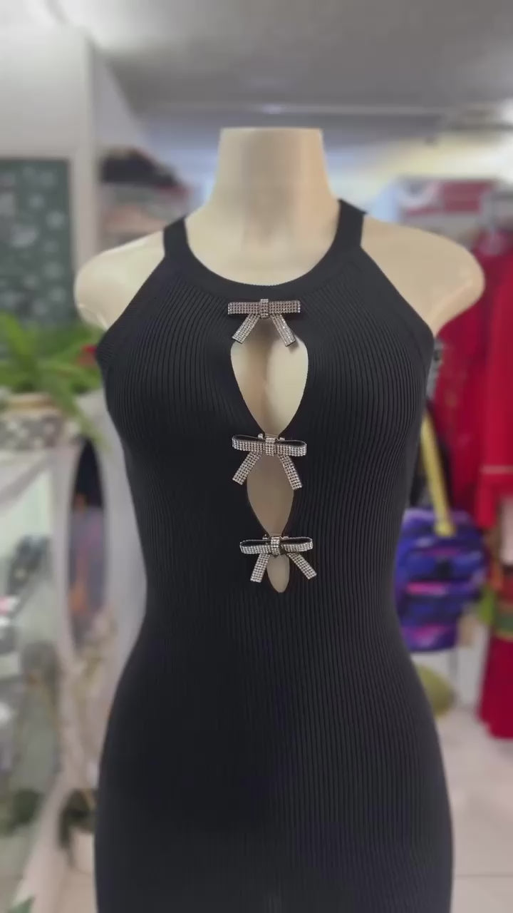 This black mini dress features a sleek silhouette enhanced by a stylish bow centerpiece, adding a refined touch to its minimalist design. Perfect for for chic evening out, offering a sophisticated and flattering fit that effortlessly elevates your look.